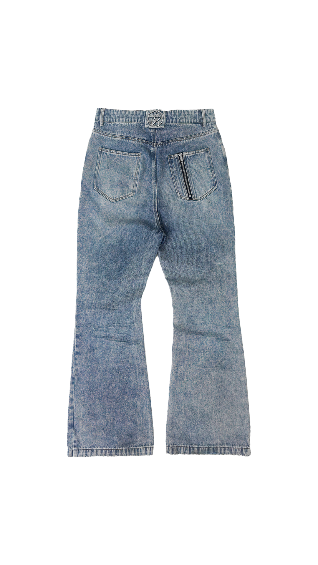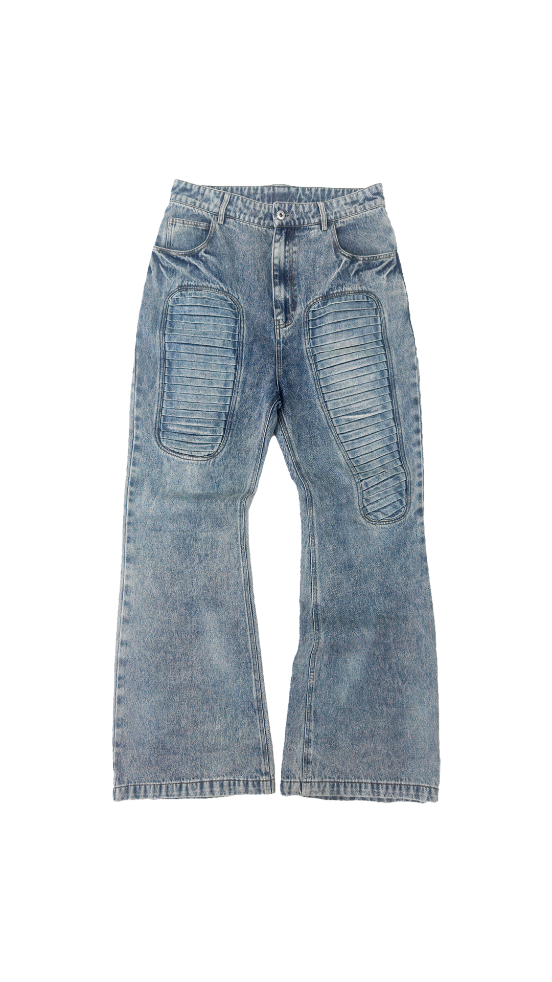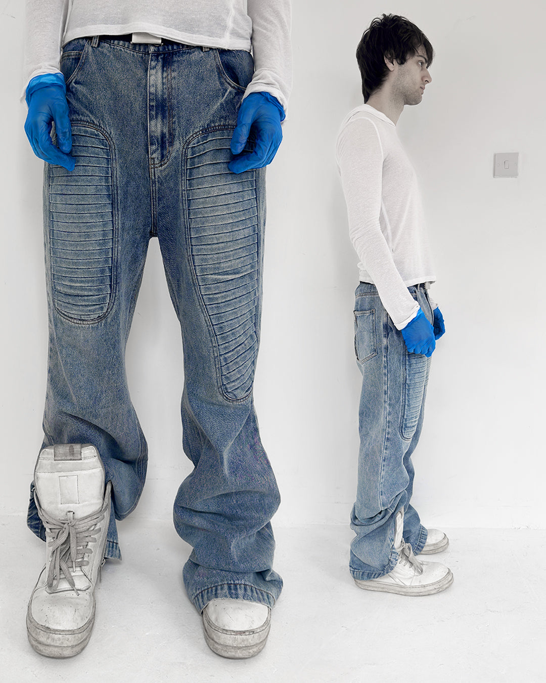 The asymmetrical pleating disrupts the natural structure of the denim, creating movement through tension and release. The flared silhouette extends the form, pushing the proportions beyond standard cuts.