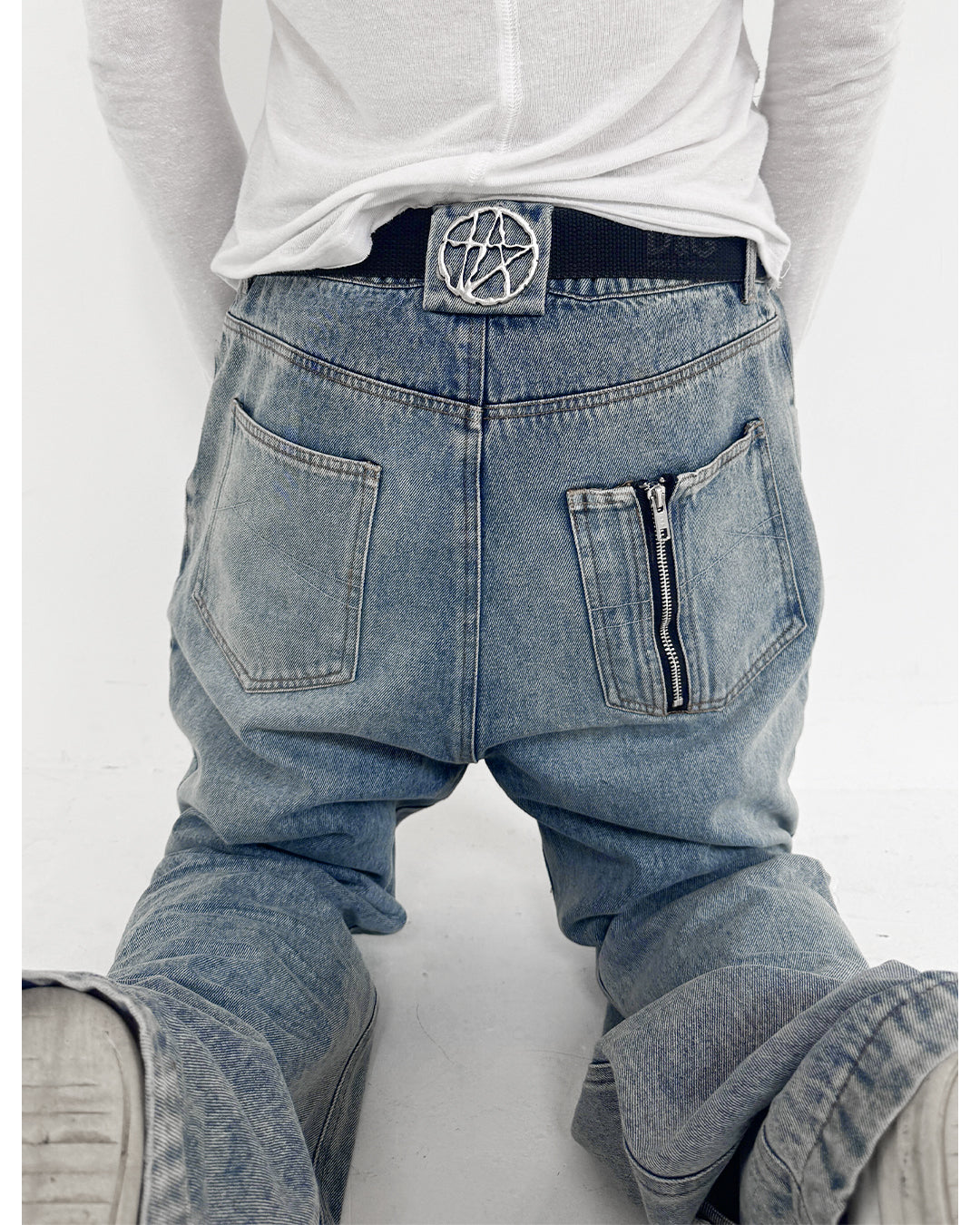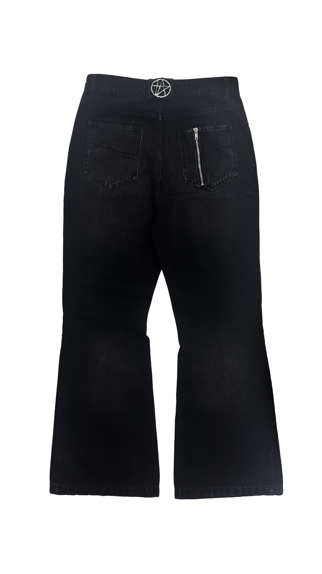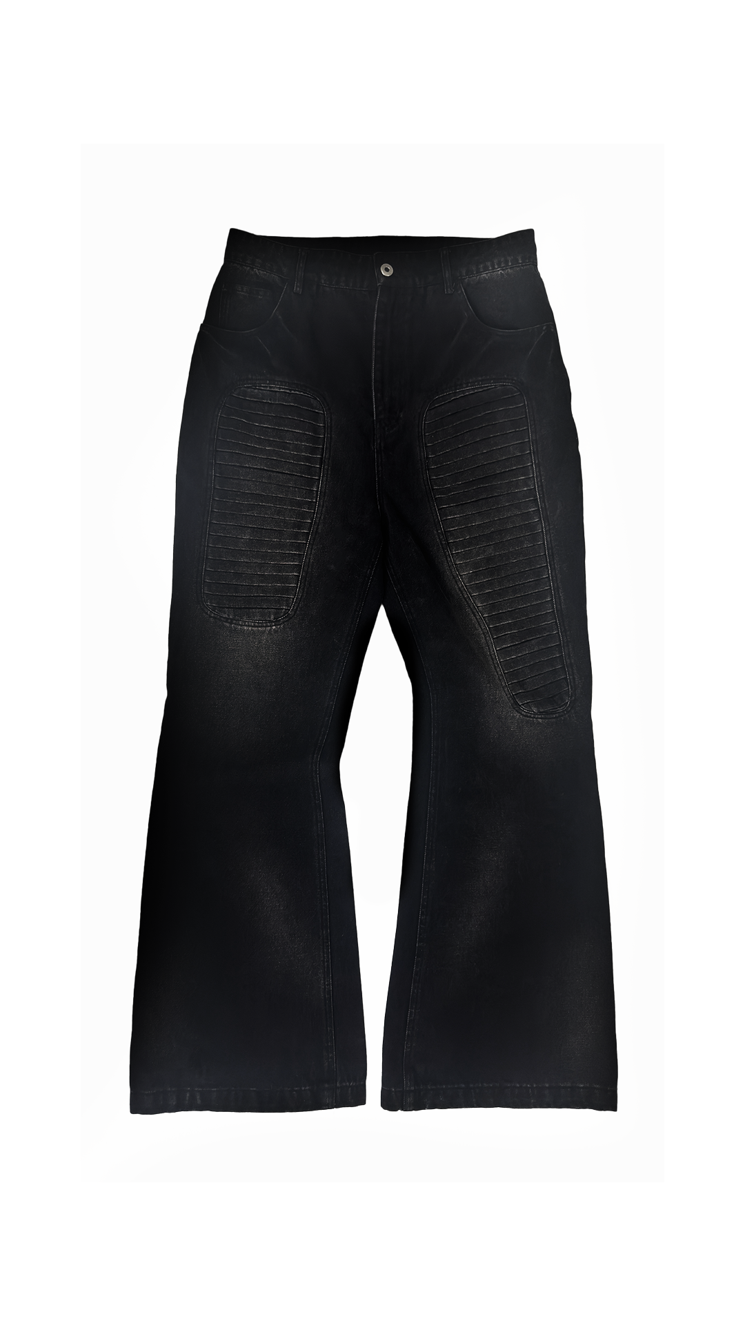 The asymmetrical pleating disrupts the natural structure of the denim, creating movement through tension and release. The flared silhouette extends the form, pushing the proportions beyond standard cuts.